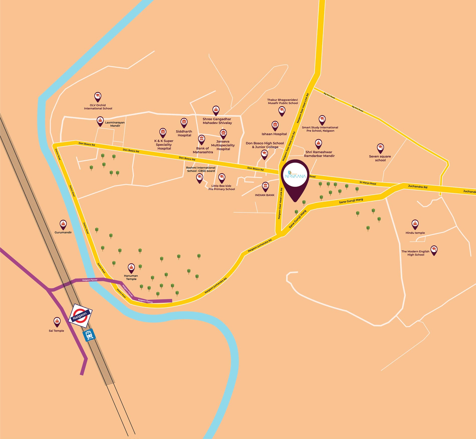Nakshatra Nirvaana places you where daily life feels easy, not effortful. With Naigaon Railway Station just minutes away, commuting becomes quicker and more predictable, giving you more time beyond travel. The upcoming bullet train corridor further enhances future connectivity and long-term value. Well-connected roads like Naigaon-Juchandra Road, Station Road, and Vasai Link Road keep you seamlessly linked to the city. Plus, schools, hospitals, temples, and banks are all close by, so everyday needs are always within reach.